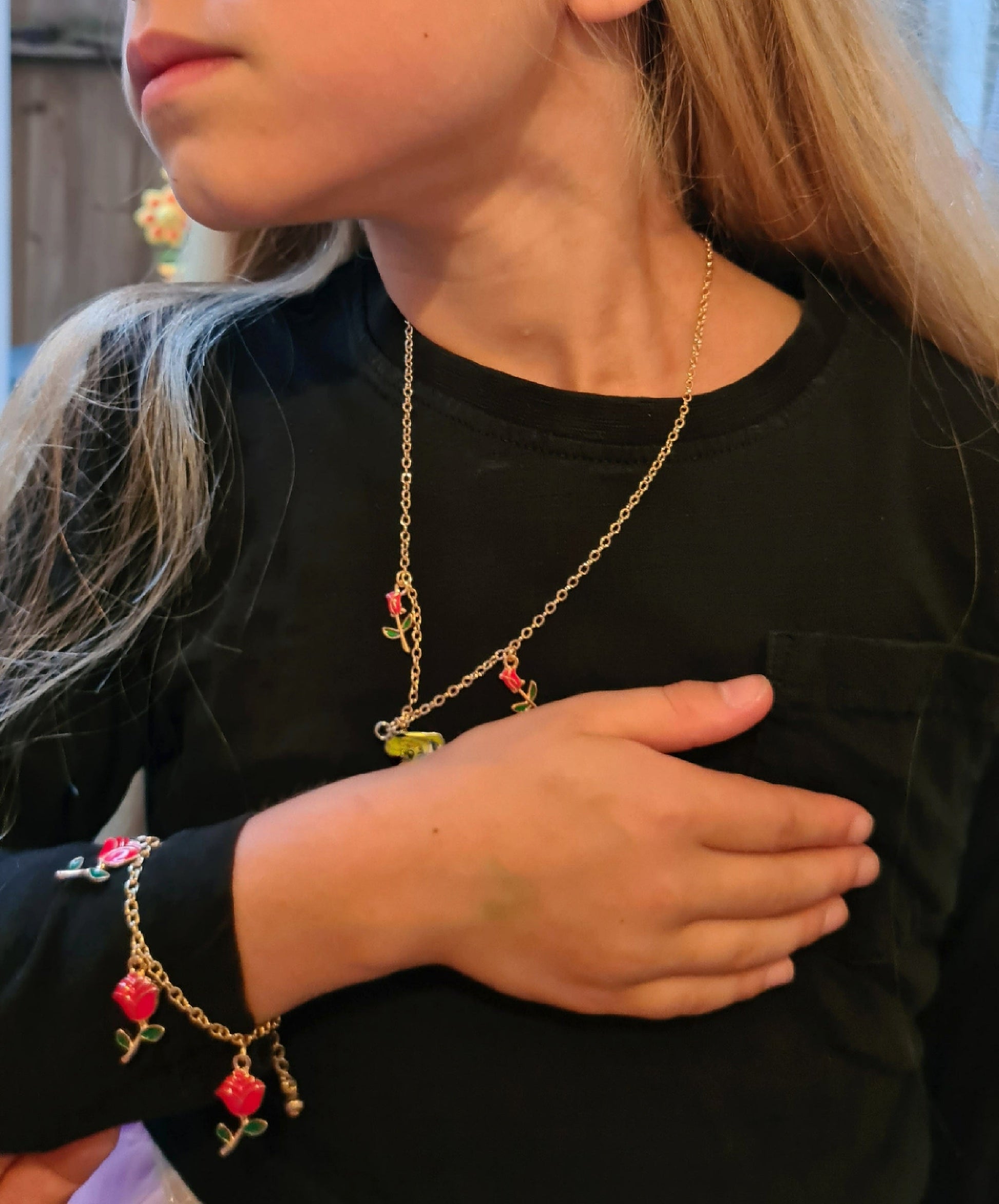 This Alice in Wonderland Bracelet captures the imagination of when Alice wanders into the Labyrinth discovering falling red roses and painting the roses red. The bracelet features an intricately-crafted design, lending a timeless elegance to any ensemble.